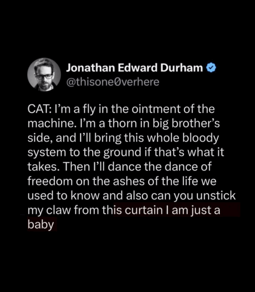 I’m feeling both hopeful and somehow deeply pessimistic: here’s something that expresses all my ambivalence. Only cats can save us.