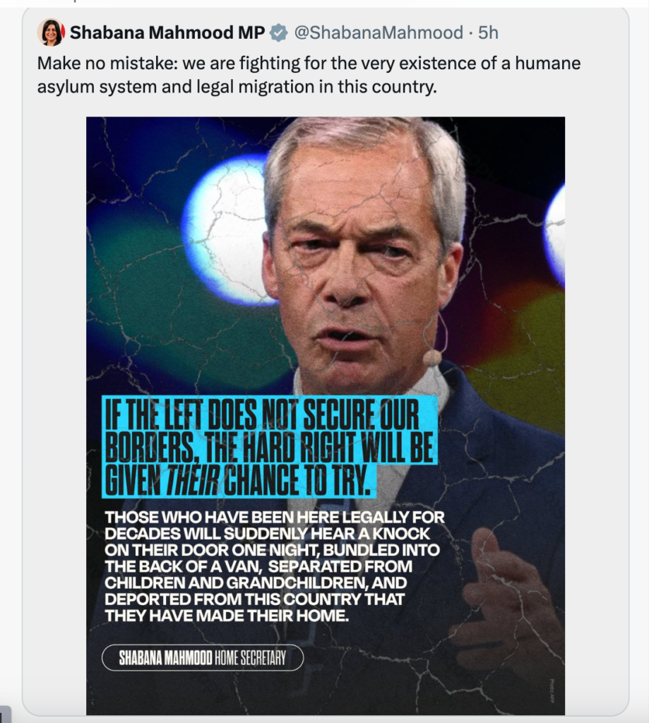 So far, British voters seem suspicious and wary of such measures, even as they grow more angry with Labour, the putatively left party that has responded to such proposals from Reform by promising to be even more repressive. Shabana Mahmood, current Home Secretary, has announced several anti-immigrant measures and even stopped study visas from Afghanistan, Cameroon, Myanmar and Sudan. In addition, Afghan nationals will no longer be issued work visas. How does Mahmood sell such Labour policy changes? By invoking the spectre of Reform, and arguing that “If the left does not secure our borders, the hard right will be given their chance to try. Those who have been here legally for decades will suddenly hear a knock on their door one night, bundled into the back of a van, separated from children and grandchildren, and deported from this country that they have made their home.”